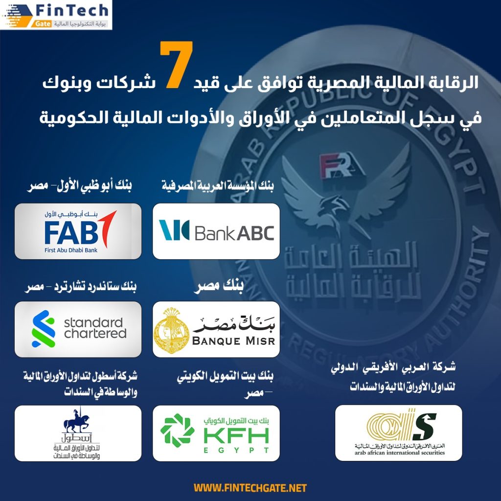 قررت لجنة تأسيس وترخيص الشركات الخاضعة لإشراف الهيئة العامة للرقابة المالية المصرية وفروعها، الموافقة لـ 7 جهات موزعين على 5 بنوك وشركتي تداول أوراق مالية على توفيق أوضاعها، للقيد في سجل الهيئة للتعامل في الأوراق والأدوات المالية الحكومية بالسوق الثانوي.