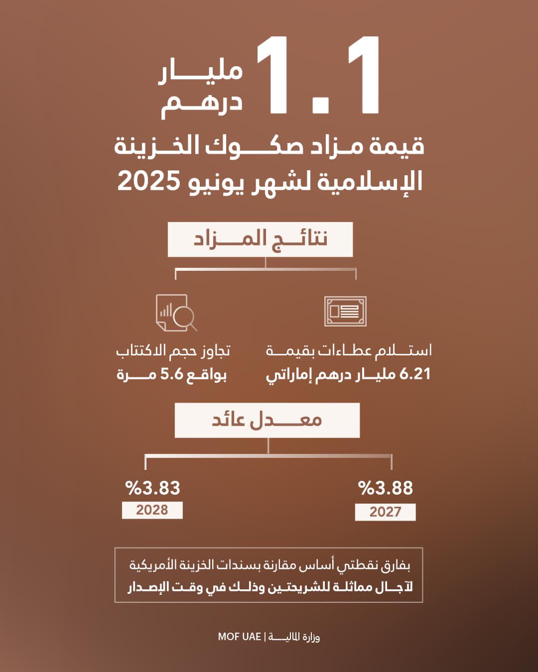 أعلنت وزارة المالية بصفتها الجهة المُصدرة وبالتعاون مع مصرف الإمارات العربية المتحدة المركزي بصفته وكيل الإصدار والدفع، عن نجاح مزاد صكوك الخزينة الإسلامية “T-Sukuk” المقوّمة بالدرهم الإماراتي، لشهر يونيو بقيمة إجمالية بلغت 1.1 مليار درهم، وذلك ضمن برنامج صكوك الخزينة الإسلامية لعام 2025 كما تم نشره على الموقع الرسمي للوزارة.
