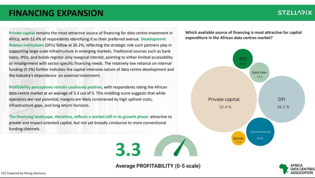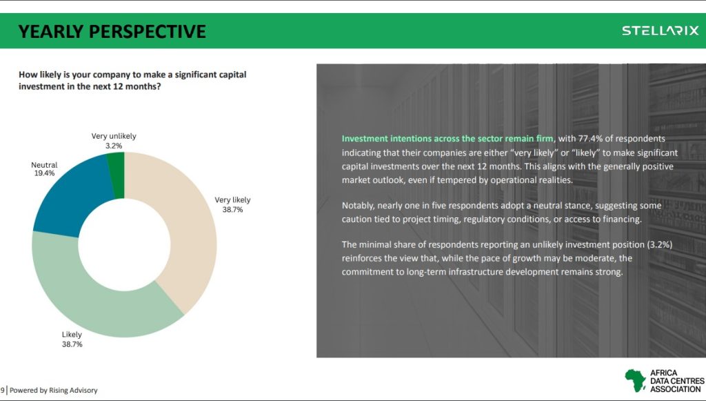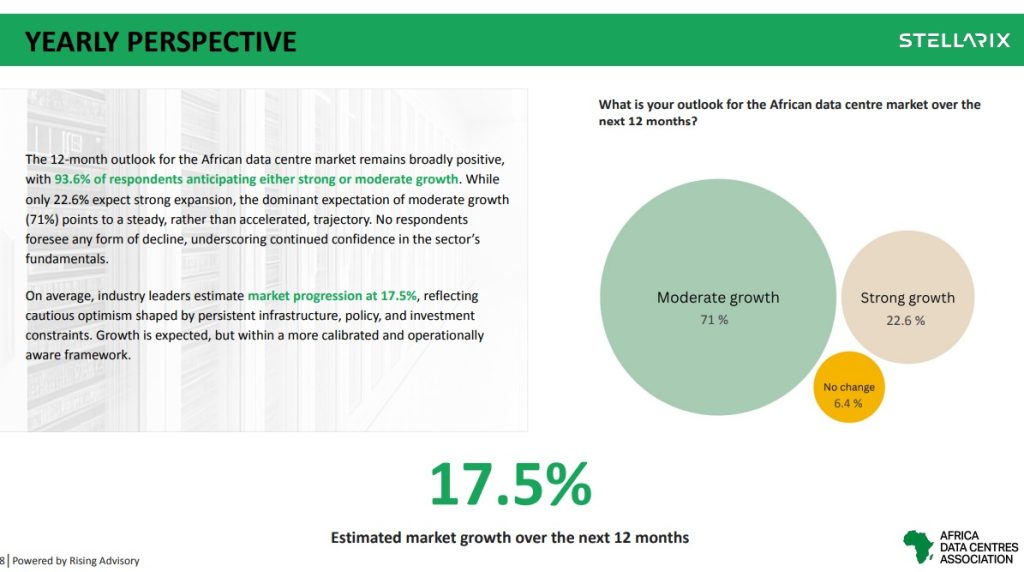 وكشف التقرير الذي حمل عنوان «مراكز البيانات في إفريقيا: إلى أين يتجه صُنّاع القرار؟»، عن حالة تفاؤل واسعة بين كبار التنفيذيين في القطاع، حيث أفاد 93.6% من المشاركين بأنهم يتوقعون نمواً قويًا أو معتدلًا، فيما لم يتوقع أي منهم حدوث تراجع في السوق، رغم التحديات المستمرة المرتبطة بالبنية التحتية والسياسات العامة وظروف التمويل.