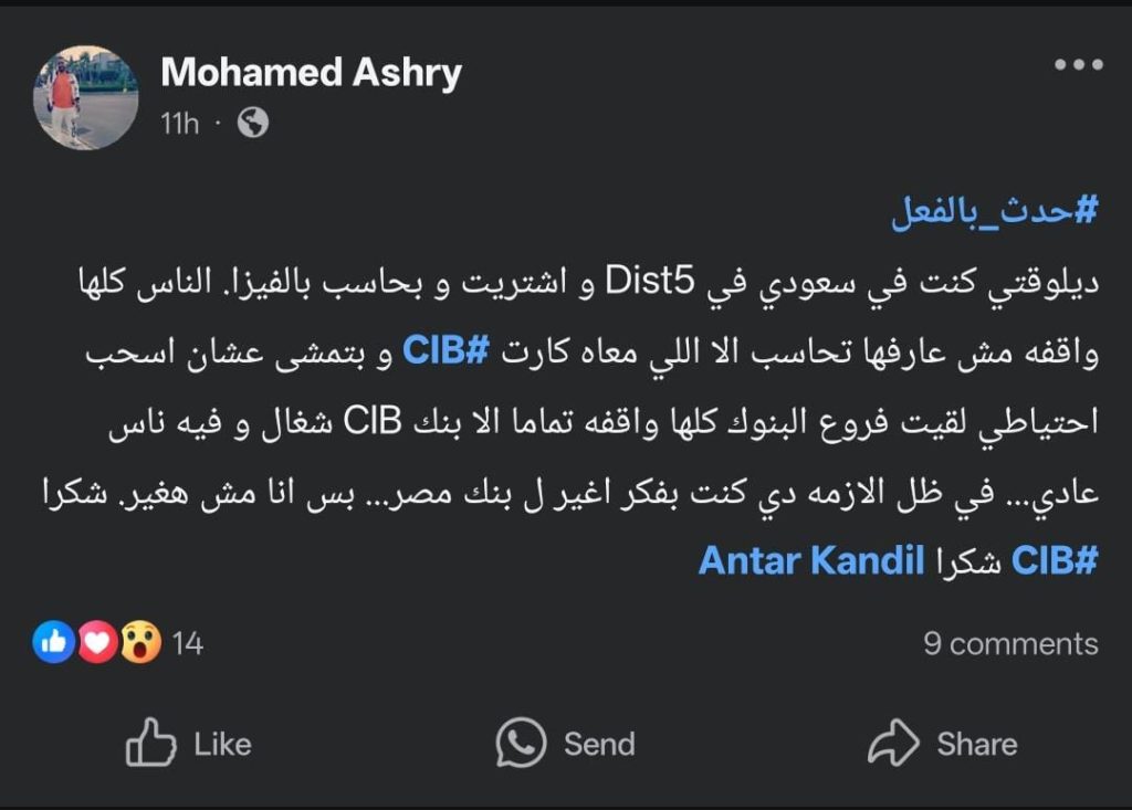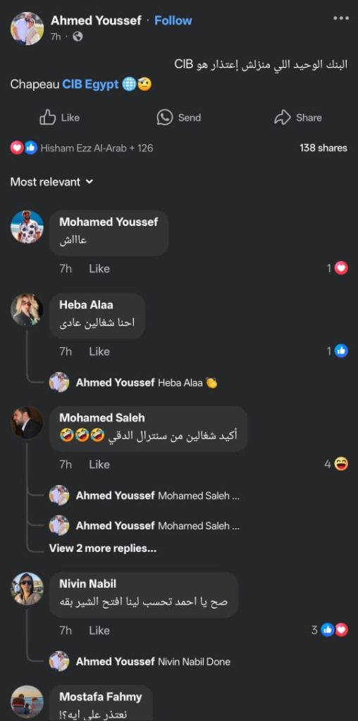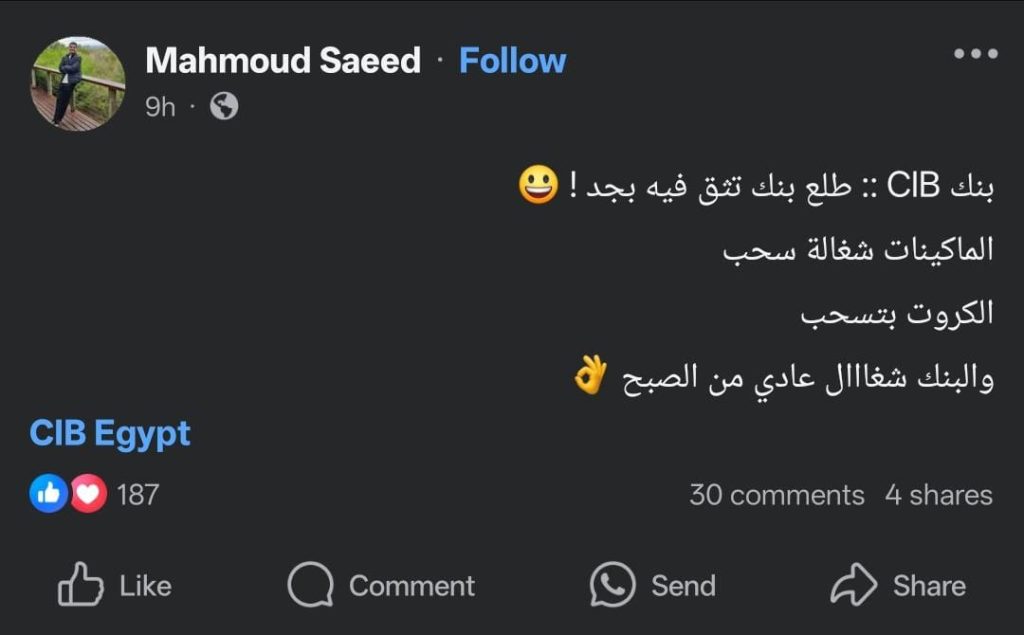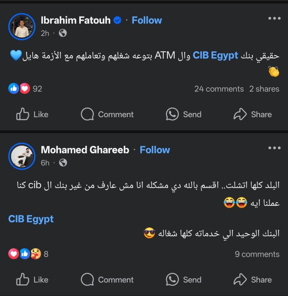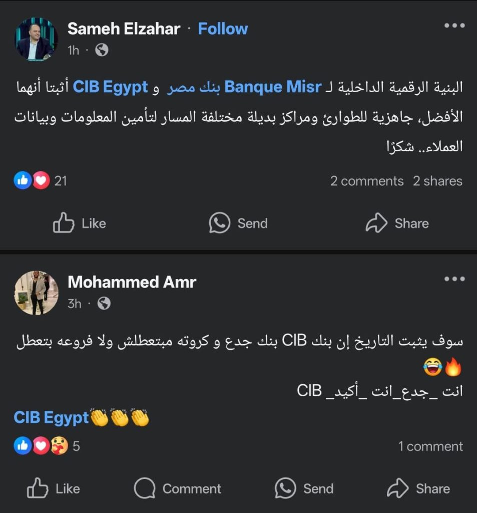 وقال أحد العملاء: “خدمات الأونلاين في CIB موقفتش ولا ثانية.. أجمد IT في مصر”. فيما أشاد آخر بقدرة البنك على تجاوز الأزمة دون أي تأثر ظاهر في البنية التحتية الرقمية الخاصة به، معتبرًا أن «CIB» يقدم نموذجًا يُحتذى به في كفاءة الأنظمة الاحتياطية واستعدادات الطوارئ.