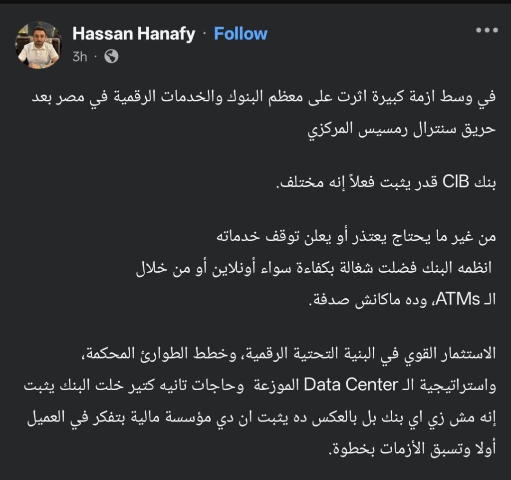 في مشهد استثنائي من التقدير والثناء، تلقى البنك التجاري الدولي – مصر (CIB) إشادات واسعة من عملائه على مواقع التواصل الاجتماعي بعد أن أثبت كفاءة استثنائية في مواجهة أزمة توقف الخدمات الرقمية التي شهدتها مصر خلال الـ24 ساعة الماضية عقب حريق سنترال رمسيس.