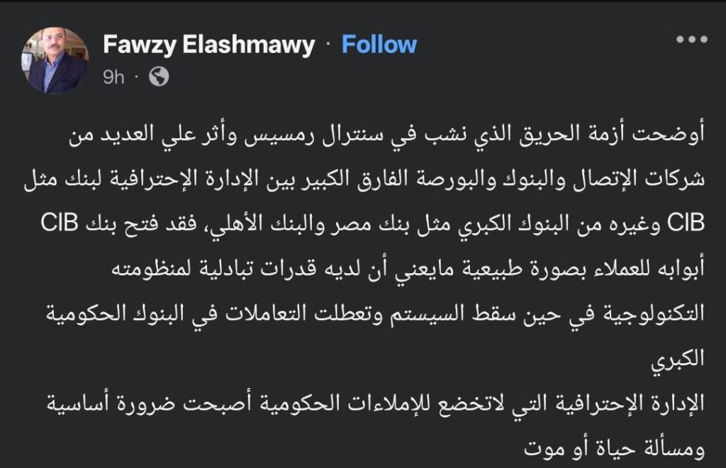 وتسبب الحريق الذي اندلع مساء الإثنين 7 يوليو بمبنى سنترال رمسيس – أحد المراكز الحيوية لشبكات الاتصالات – في توقف خدمات أساسية لملايين المستخدمين. وتضررت بشكل مباشر معظم البنوك التي تعتمد على الشبكات العامة في تقديم خدماتها الرقمية، إلى جانب شركات المحافظ الإلكترونية وتطبيقات الدفع الفوري.