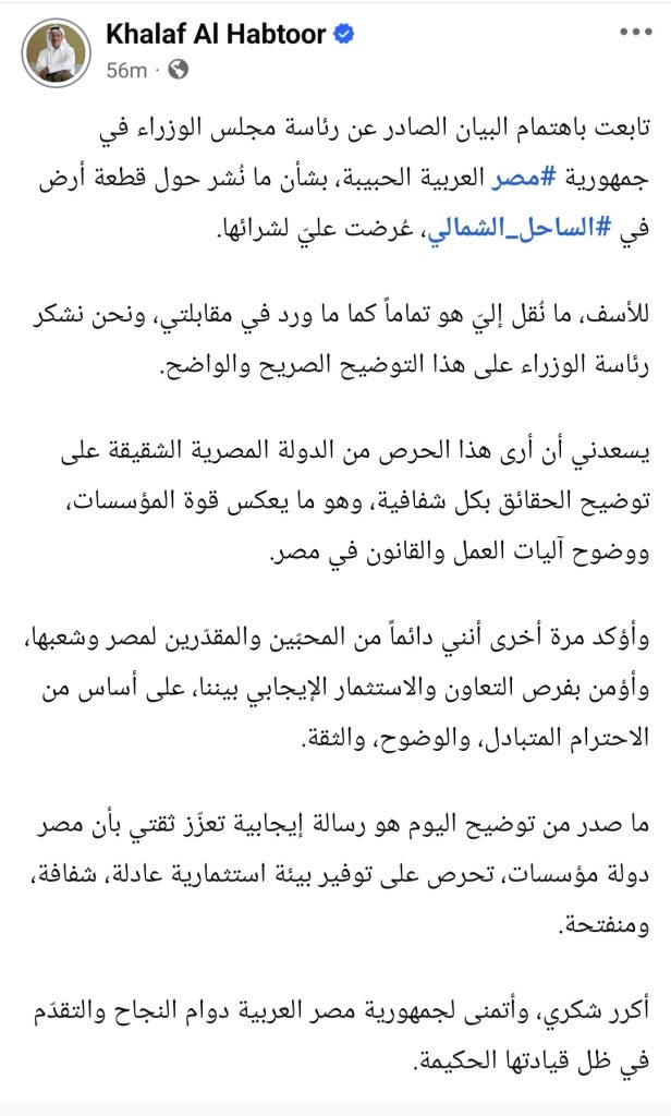 وقال خلف الحبتور،” تابعت باهتمام البيان الصادر عن رئاسة مجلس الوزراء في جمهورية مصر العربية الحبيبة، بشأن ما نُشر حول قطعة أرض في الساحل الشمالي، عُرضت عليّ لشرائها.. للأسف، ما نُقل إليّ هو تماماً كما ما ورد في مقابلتي، ونحن نشكر رئاسة الوزراء على هذا التوضيح الصريح والواضح”.