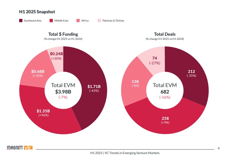 وصدر هذا التحليل ضمن تقرير النصف الأول من عام 2025 الصادر عن منصة البيانات والاستثمار «MAGNiTT»، والتي تُعنى برصد تحولات مشهد رأس المال المغامر في الأسواق الناشئة، وخاصة في مناطق الشرق الأوسط وأفريقيا وجنوب شرق آسيا.
