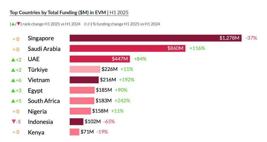 وبحسب التقرير، واصلت المملكة العربية السعودية تعزيز مكانتها عالميًا، محتفظة بالمركز الثاني عالميًا في قيمة التمويل بـ860 مليون دولار، بنمو سنوي 116%، بالتوازي مع نمو الصفقات إلى 114 صفقة. أما الإمارات فقد جمعت 447 مليون دولار بزيادة 84% على أساس سنوي، بعد عودة قوية للاستثمار الأجنبي المباشر في قطاع الشركات الناشئة.