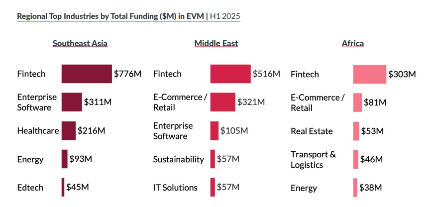 أما أفريقيا، فسجّلت نموًا بنسبة 56% على أساس سنوي لتبلغ التمويلات 676 مليون دولار، رغم غياب الصفقات العملاقة (MEGA Deals). ويعود هذا التحسن بشكل رئيسي إلى تضاعف عدد جولات Series A وثلاثة أضعاف جولات Series B مقارنة بالنصف الأول من 2024.