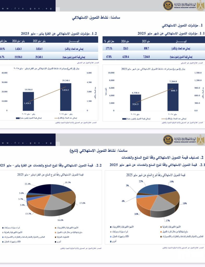 «الرقابة المالية» : التمويل الاستهلاكي يرتفع لأكثر من 29 مليار جنيه خلال أول 5 أشهر من 2025.. والعملاء يتجاوزون 3.8 مليون