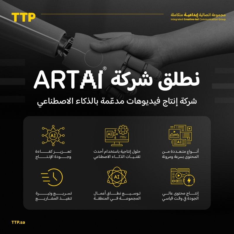أعلنت مجموعة «تي تي بي» (TTP Media Group)، المتخصصة في مجال التسويق والعلاقات العامة، عن تدشين شركتها الجديدة «أرت ايه اي» (ARTAI)، أول ذراع إنتاجي تابع للمجموعة يعتمد كليًا على تقنيات الذكاء الاصطناعي لإنتاج الإعلانات والفيديوهات.