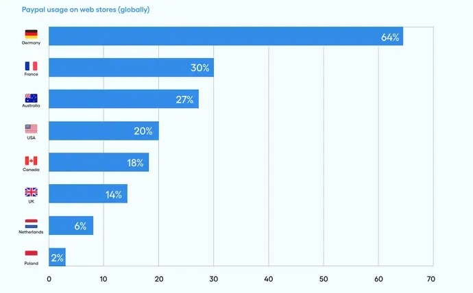 أما في ألمانيا، فتتصدر «PayPal» خيارات الدفع الإلكتروني، حيث تشكل 64% من المعاملات عبر المتاجر الإلكترونية، وهي نسبة تفوق بكثير نسب استخدامها في أسواق رئيسية أخرى، مثل الولايات المتحدة (20%) والمملكة المتحدة (14%).