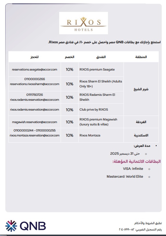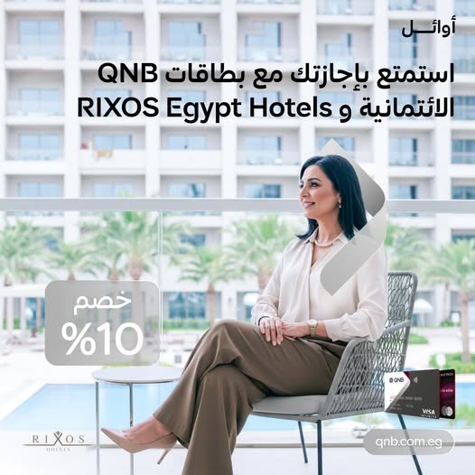 أعلن بنك QNB مصر في إطار حرصه على تقديم تجارب استثنائية ومزايا حصرية لعملائه، عن عرض جديد يتيح لحاملي بطاقاته الائتمانية “فيزا انفينيت” و”ماستركارد وورلد ايليت” قضاء عطلة فاخرة بأسعار مخفّضة، من خلال خصم خاص بنسبة 10% عند الإقامة في فنادق RIXOS الفاخرة، وذلك حتى 31 ديسمبر 2025.