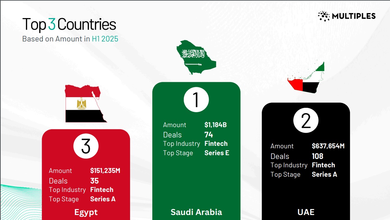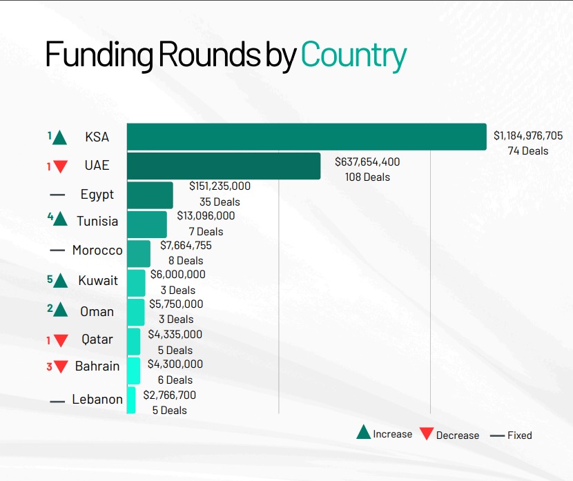 وتصدرت السعودية المشهد الاستثماري بتمويلات قدرها 1.18 مليار دولار موزعة على 74 صفقة، تلتها الإمارات بـ637.7 مليون دولار عبر 108 جولات تمويلية، فيما جذبت مصر استثمارات بلغت 151.2 مليون دولار من خلال 35 صفقة.