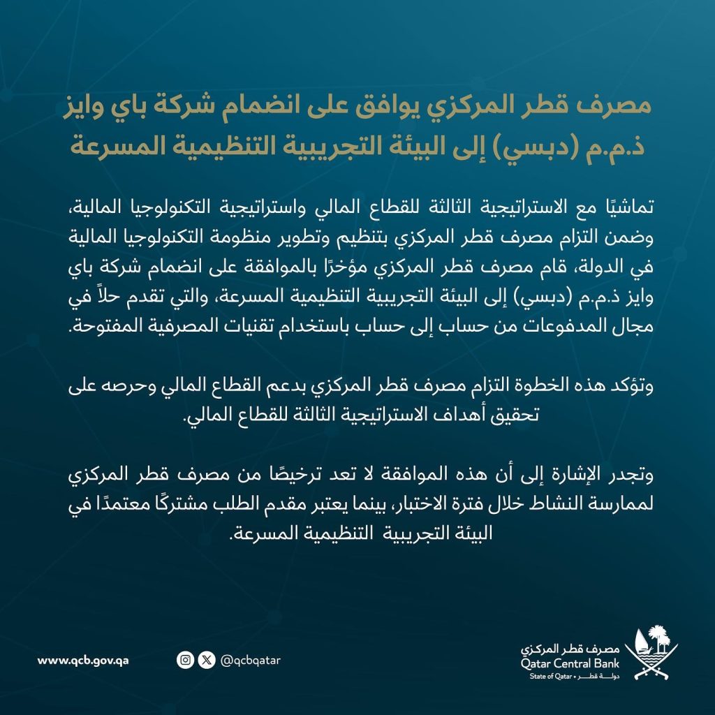 وافق مصرف قطر المركزي على انضمام شركة Paywise إلى البيئة التجريبية التنظيمية المسرعة، والتي تقدم حلا في مجال المدفوعات من حساب إلى حساب باستخدام تقنيات المصرفية المفتوحة.