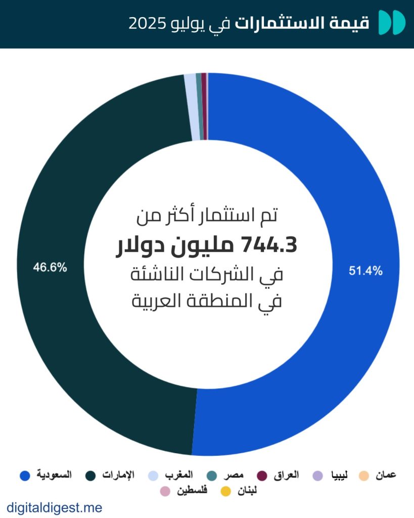 كشفت بيانات منصة «Digital Digest» أن الشركات الناشئة في المنطقة العربية جمعت استثمارات تجاوزت 744.3 مليون دولار خلال شهر يوليو 2025، وسط زخم ملحوظ في بيئة ريادة الأعمال الخليجية، حيث هيمنت السعودية والإمارات على القيمة الأكبر من التمويلات.