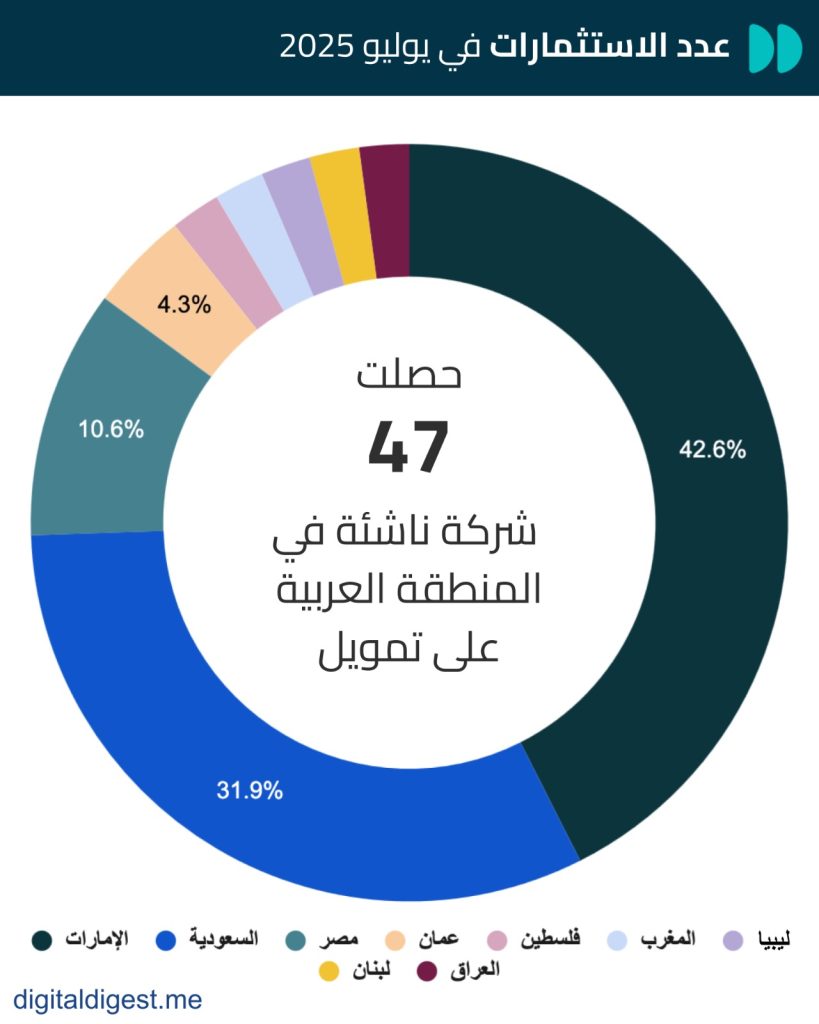 بحسب بيانات «Digital Digest» شهدت بيئة الشركات الناشئة في المنطقة العربية نشاطًا ملحوظًا خلال شهر يوليو 2025، حيث حصلت 47 شركة ناشئة على تمويل، وتوزعت هذه الاستثمارات بشكل متفاوت بين دول المنطقة، مع هيمنة واضحة للإمارات والسعودية على الحصة الأكبر من الصفقات.