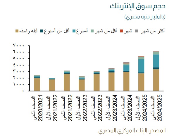 قال البنك المركزي المصري، إن سوق الإنتربنك شهد نشاطًا ملحوظًا خلال النصف الثاني من السنة المالية 2024/2025، حيث ارتفع بنسبة 14% مقارنة بالنصف الأول، وذلك مع تقييد أوضاع السيولة، مما دفع البنوك إلى زيادة اعتمادها على سوق الإنتربنك لأغراض إدارة السيولة.