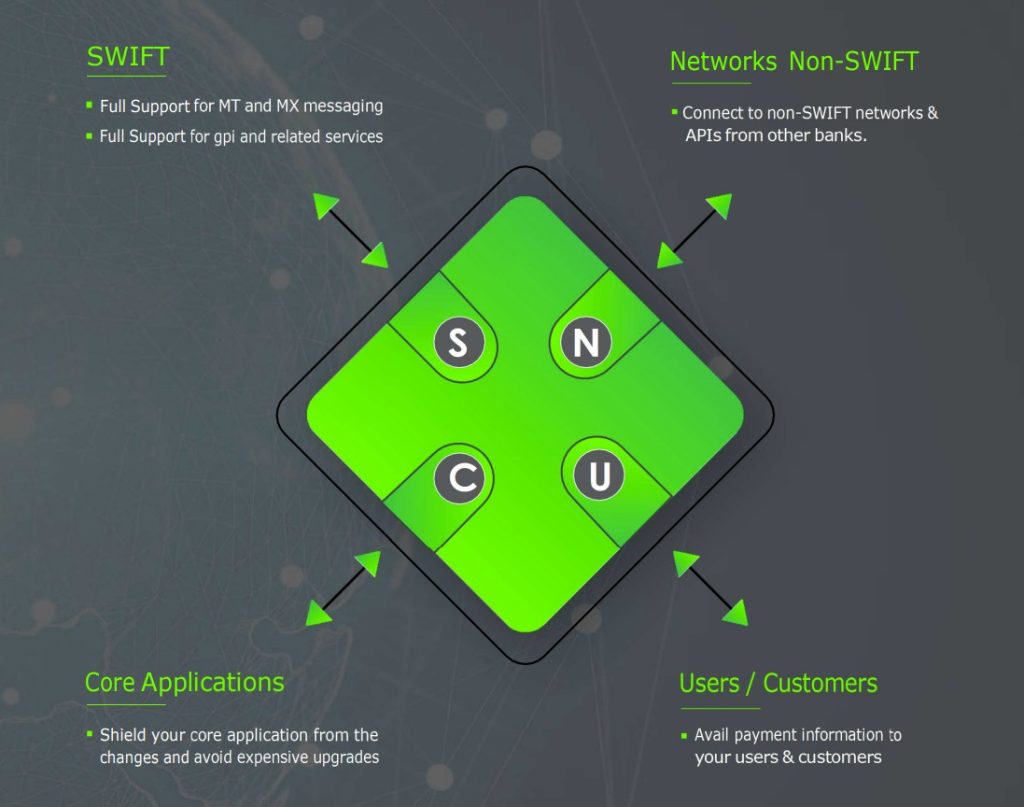 وتدعم التكامل مع الواجهات البرمجية الحديثة لشبكة سويفت الدولية الخاصة بالاستقسارات و التحقق من المدفوعات المتعثرة وبياناتها SWIFT Case Management، وتوليد تلقائي لملفات دورة حياة المدقوعات بكل مستنداتها وسجلاتها.