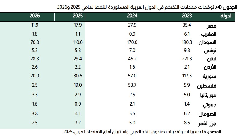 في المقابل، يُتوقع استمرار تراجع معدلات التضخم، لتسجل نحو 20.8% في 2025 و14.2% في 2026، مقارنة بـ31.9% في 2024. ومع استبعاد الدول التي تشهد ضغوطاً تضخمية استثنائية، يُتوقع أن يبلغ معدل التضخم 7.6% في 2025، و5.6% في 2026.