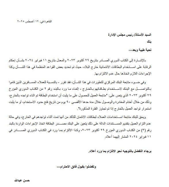 وأكد البنك المركزي حق البنوك في متابعة عمليات استبدال العملاء لبطاقاتهم للتأكد أنها تمت أثناء تواجدهم فى الخارج وفي حالة عدم تقديم العملاء المستندات الدالة على ذلك، يتعين على البنك مصدر البطاقة اتخاذ الإجراءات المنصوص عليها في البند رقم (3) من الكتاب الدوري الصادر بتاريخ 29 أكتوبر 2023، مع الالتزام بالتعديلات الواردة في الكتاب الدوري المعدل بتاريخ 11 فبراير 2024.