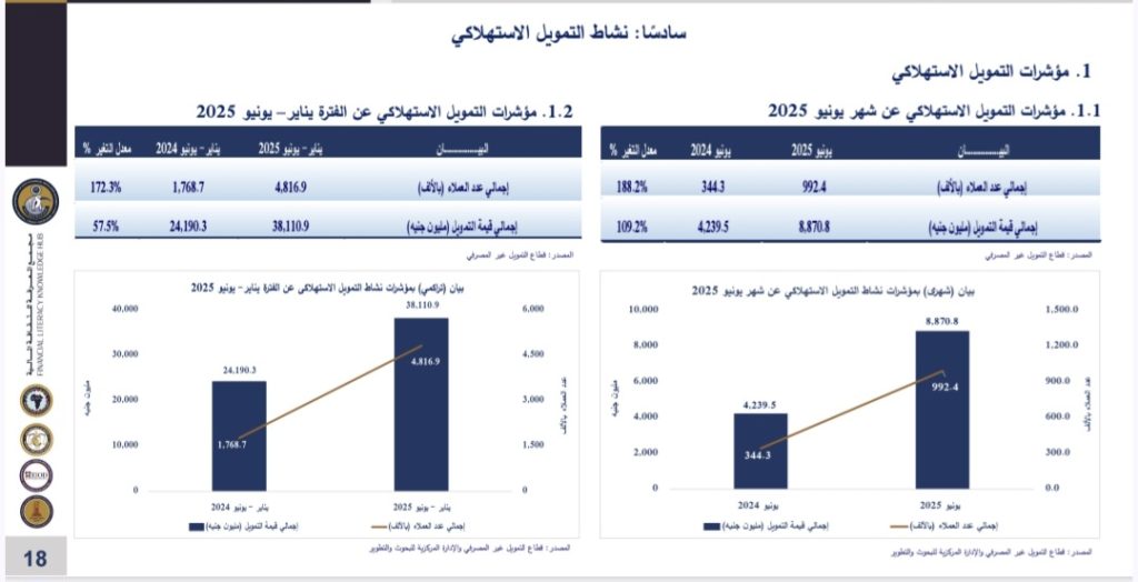 وكشف التقرير الشهري الصادر عن الهيئة العامة للرقابة المالية حصلت بوابة التكنولوجيا المالية “Fintech Gate” على نسخة منه عن ارتفاع عدد العملاء ليصل الى 4.816 مليون عميل بنهاية يونيو الماضي، مقابل 1.768 مليون عميل بنهاية يونيو 2024 بزيادة بلغت نحو 172.3%
