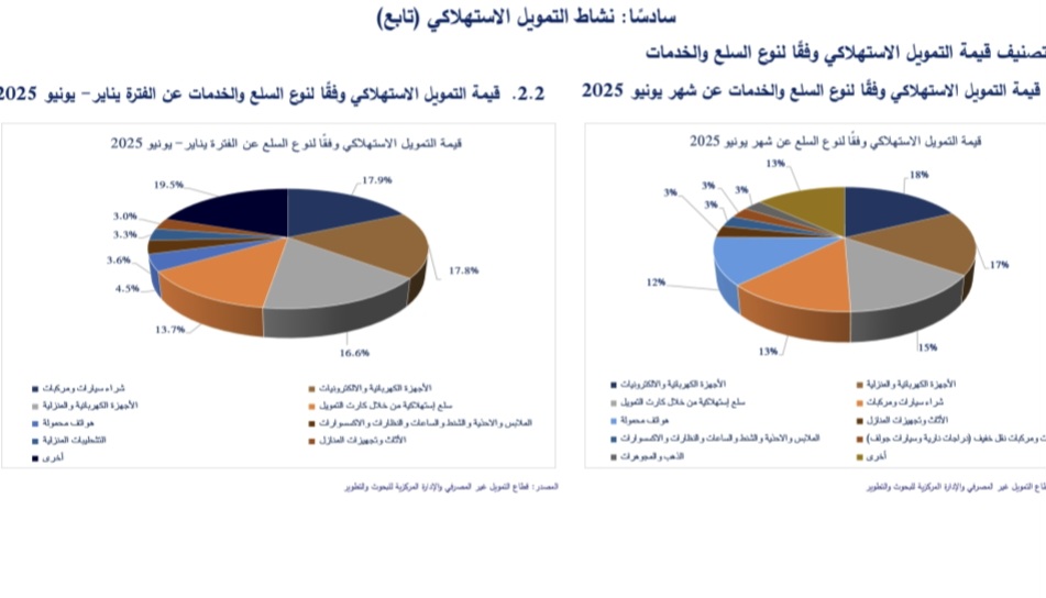 وأضاف خلال النصف الأول من 2025 استحوذ قطاع «شراء السيارات والمركبات» على نسبة 17.9% من قيمة التمويلات،تلاه في المرتبة الثانية «الأجهزة الكهربائية والالكترونيات» على نسبة 17.8% من إجمالي التمويلات