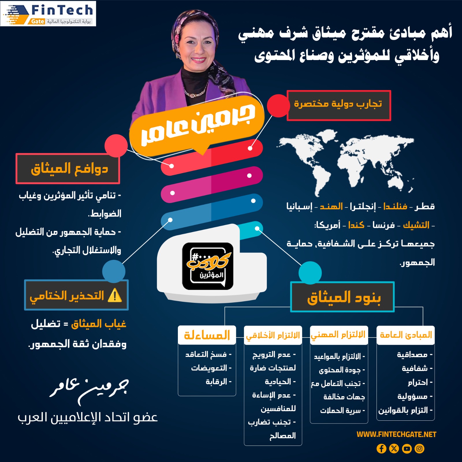 في ظل النمو المتسارع لدور المؤثرين وصناع المحتوى في تشكيل الرأي العام الرقمي وتعزيز الثقافة الرقمية لملايين المتابعين، ومع تصاعد الحاجة إلى تنظيم هذا المجال وضمان معاييره المهنية والأخلاقية، قدمت الإعلامية چرمين عامر، عضو اتحاد الإعلاميين العرب، عبر مبادرة #كوكب_المؤثرين، مقترحاً لميثاق شرف مهني وأخلاقي شامل، مستند إلى دراسة متأنية لعدد من المواثيق الإعلامية الدولية، ليكون مرجعاً معتمداً يلتزم به المؤثرون والمؤسسات الإعلامية في جميع أنشطتهم.