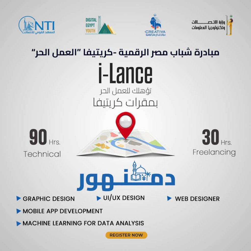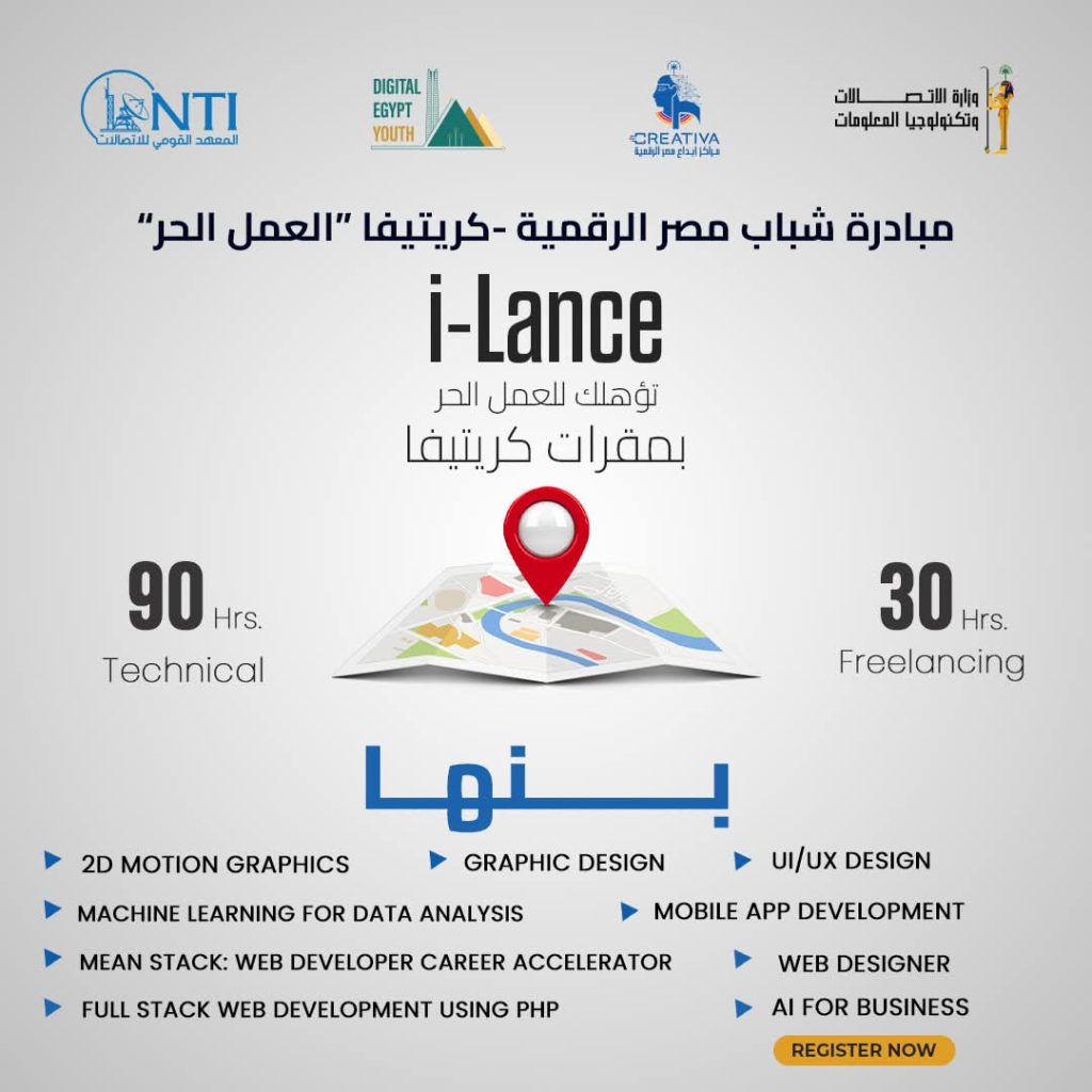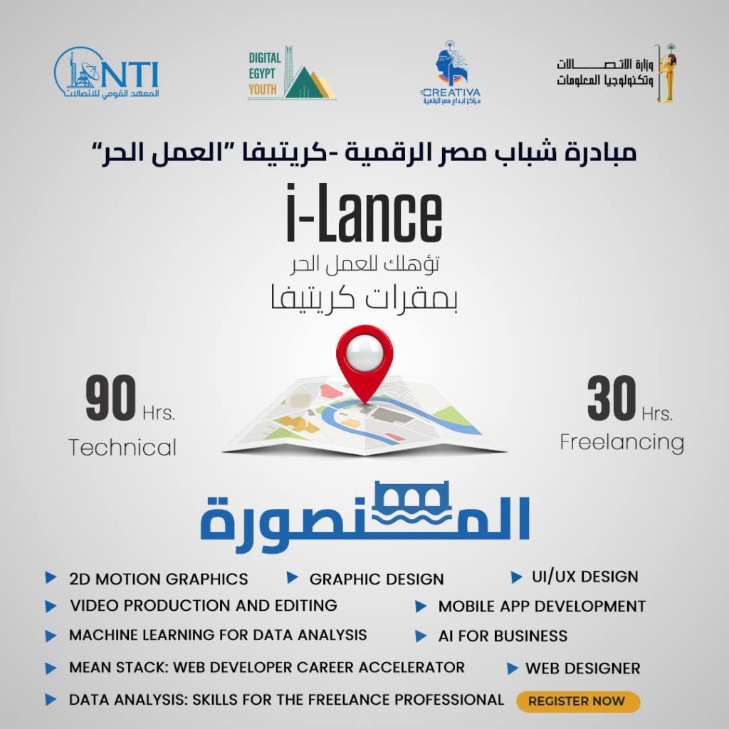 أعلن المعهد القومي للاتصالات عن فتح باب التسجيل في “مبادرة شباب مصر الرقمية بمراكز إبداع مصر الرقمية” في برنامج i-Lance في عدة محافظات، هي المنصورة ودمنهور وبورسعيد والإسكندرية والمنوفية وبنها والزقازيق وطنطا. ويوفر البرنامج فرصًا تعليمية متميزة وتدريبًا عمليًا في مجالات الاتصالات وتكنولوجيا المعلومات.