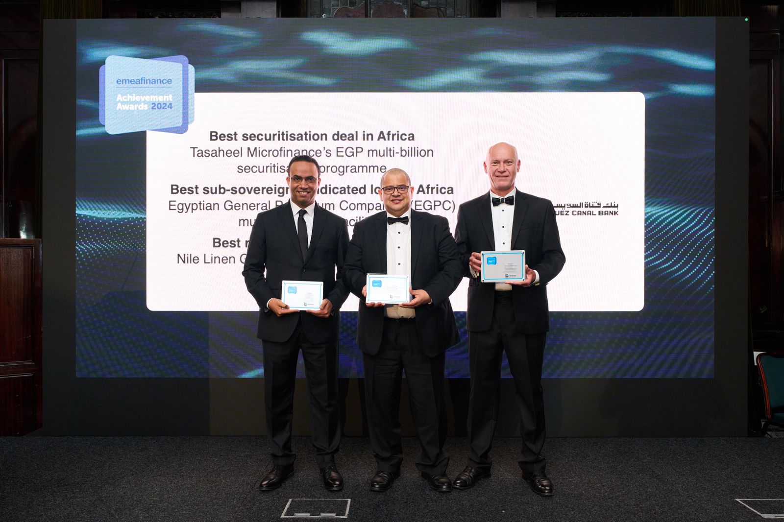تسلّم الجوائز الأستاذ شهاب زيدان، نائب الرئيس التنفيذي والعضو المنتدب لبنك قناة السويس، والأستاذ السيد الفقي، رئيس قطاع تمويل الشركات والخدمات الاستثمارية، خلال الحفل السنوي للمجلة في لندن، بحضور ممثلي كبرى المؤسسات المالية والاستثمارية حول العالم.