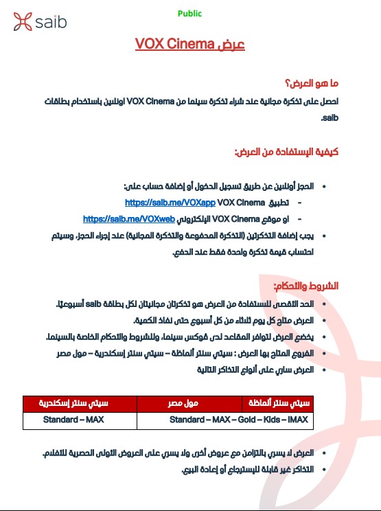 أعلن بنك «saib» (مصر) عن إطلاق عرض حصري لعملائه يتيح لهم الاستمتاع بفرصة الحصول على تذكرة سينما مجانية عند حجز تذكرة أخرى من «VOX Cinema»، عند الدفع باستخدام بطاقات البنك.