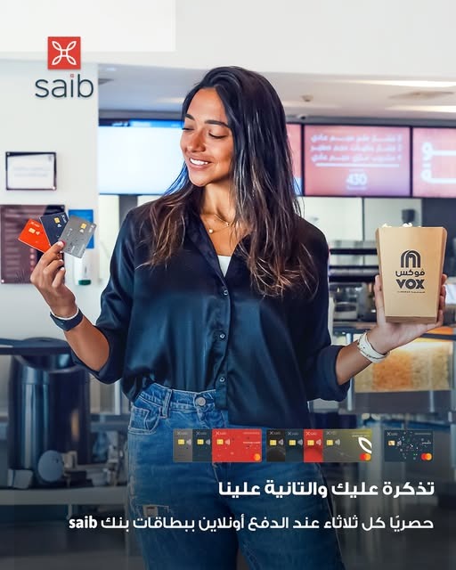 أعلن بنك «saib» (مصر) عن إطلاق عرض حصري لعملائه يتيح لهم الاستمتاع بفرصة الحصول على تذكرة سينما مجانية عند حجز تذكرة أخرى من «VOX Cinema»، عند الدفع باستخدام بطاقات البنك.