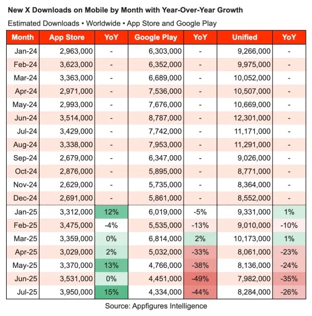يواجه تطبيق «X» المملوك لإيلون ماسك تحديات متزايدة على أجهزة أندرويد، إذ أظهرت بيانات من شركة Appfigures أن التنزيلات عبر Google Play تراجعت في يوليو 2025 بنسبة 44% على أساس سنوي، مقابل نمو بنسبة 15% عبر متجر App Store. هذا الانخفاض أدى إلى هبوط إجمالي تحميلات التطبيق على الهواتف الذكية بنسبة 26% سنويًا، رغم أنه أفضل نسبيًا من يونيو حين بلغ التراجع 35%.
