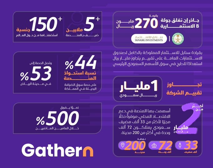 أعلنت شركة “جاذر إن”، المنصة السعودية الرائدة في قطاع الضيافة البديلة، عن إغلاق جولتها الاستثمارية من الفئة B بقيمة 270 مليون ريال سعودي، بقيادة سنابل للاستثمار – المملوكة بالكامل لصندوق الاستثمارات العامة – وبمشاركة كل من Endeavor Catalyst، Pinnacle Capital، Nuwa Capital، و STV.
