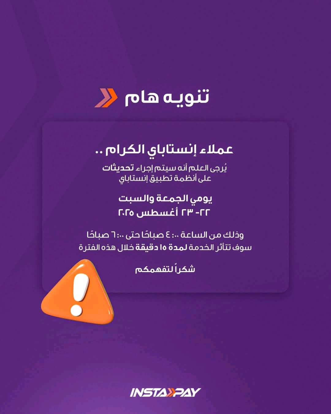 في إطار سعيها المستمر لتحسين جودة الخدمات الرقمية المقدمة لعملائها، أعلنت شبكة المدفوعات اللحظية “إنستاباي” التابعة للبنك المركزي المصري عن إجراء تحديثات دورية على أنظمة تطبيقها الإلكتروني «إنستاباي» خلال يومي الجمعة والسبت الموافقين 23 و24 أغسطس 2025.