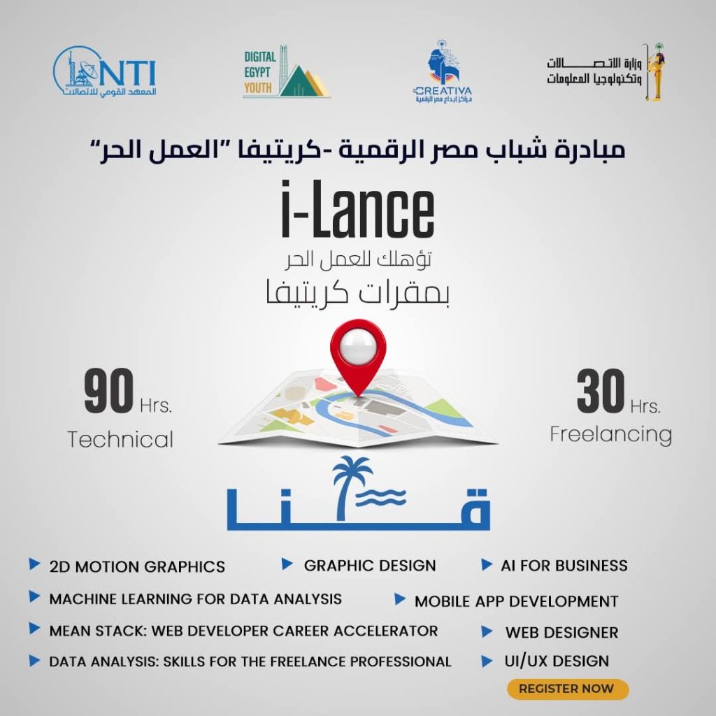 أعلن المعهد القومي للاتصالات عن فتح باب التسجيل في برنامج i-Lance ضمن مبادرة شباب مصر الرقمية بمراكز إبداع مصر الرقمية في جامعة القاهرة والفيوم وقنا وبني سويف والوادي الجديد والعريش وأسيوط والمنيا وسوهاج وأسوان.