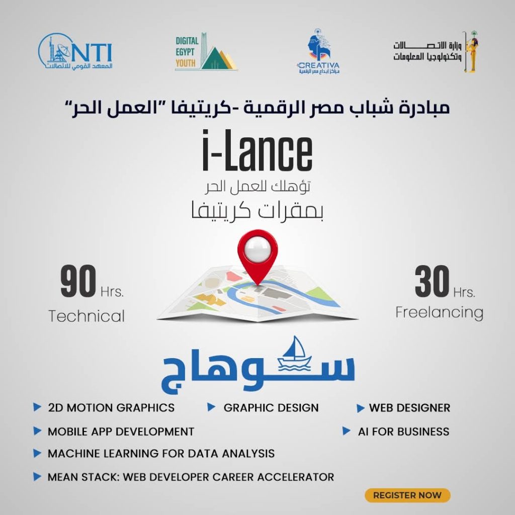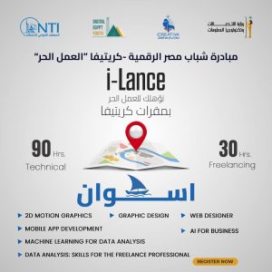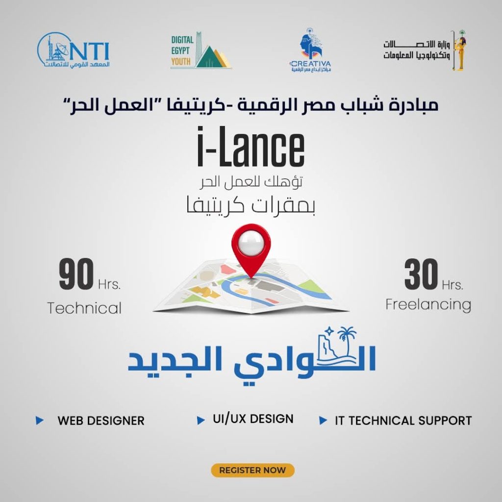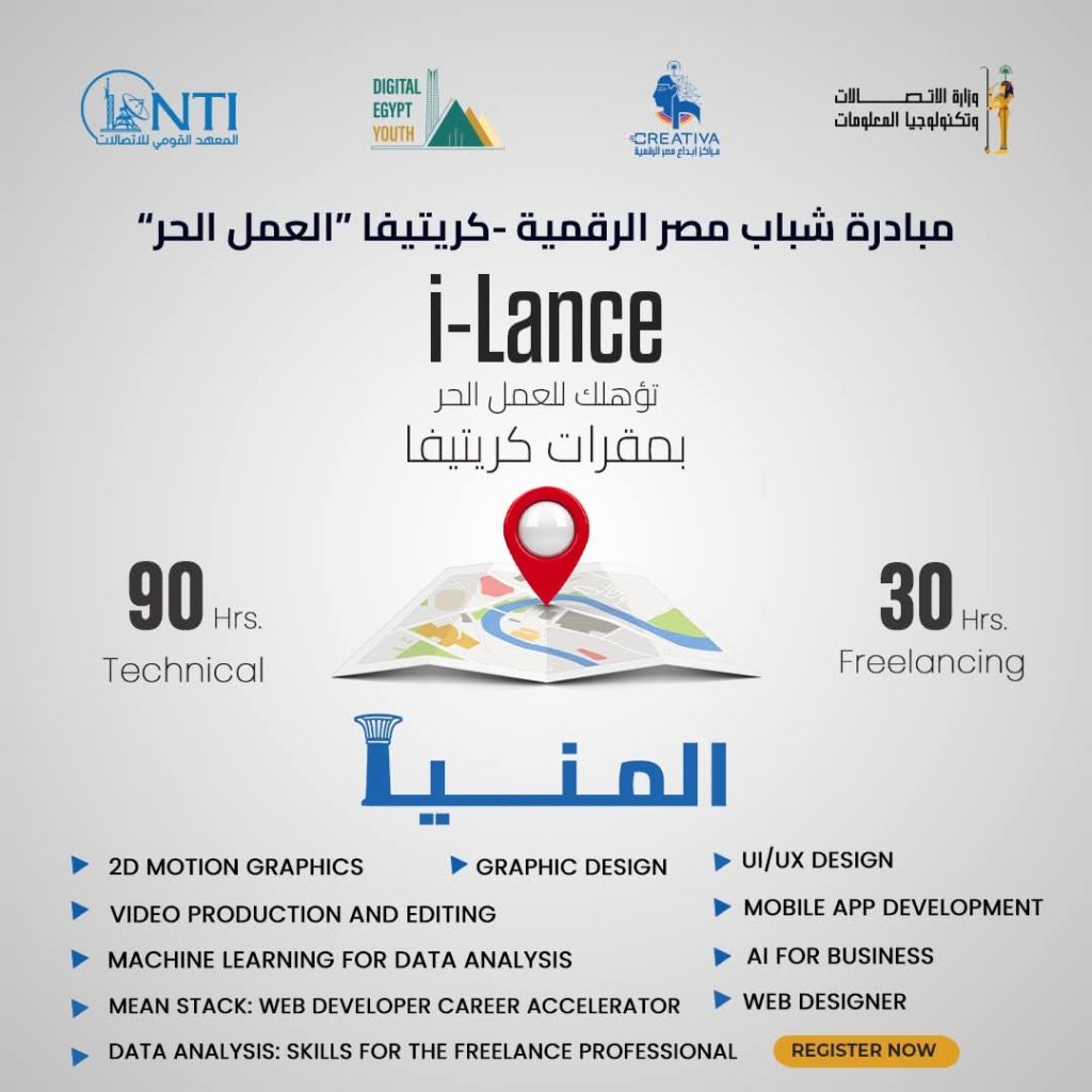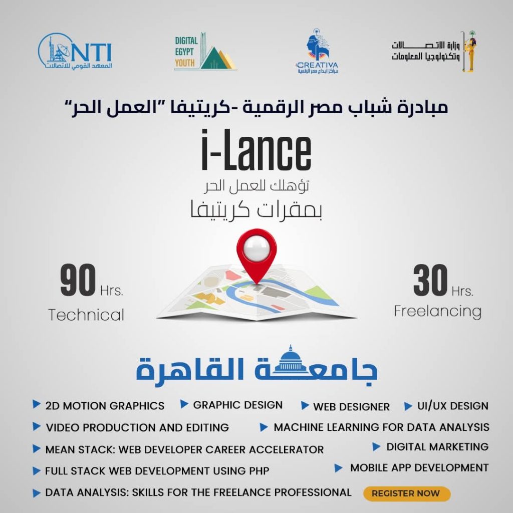 أعلن المعهد القومي للاتصالات عن فتح باب التسجيل في برنامج i-Lance ضمن مبادرة شباب مصر الرقمية بمراكز إبداع مصر الرقمية في جامعة القاهرة والفيوم وقنا وبني سويف والوادي الجديد والعريش وأسيوط والمنيا وسوهاج وأسوان.