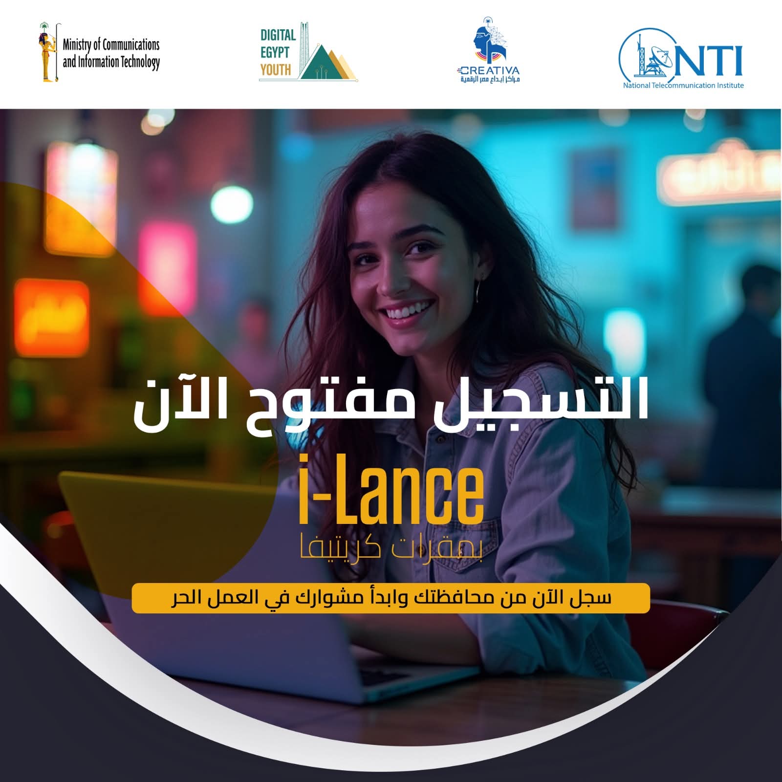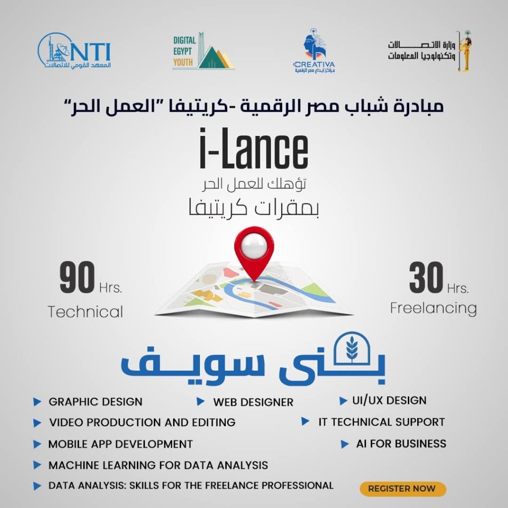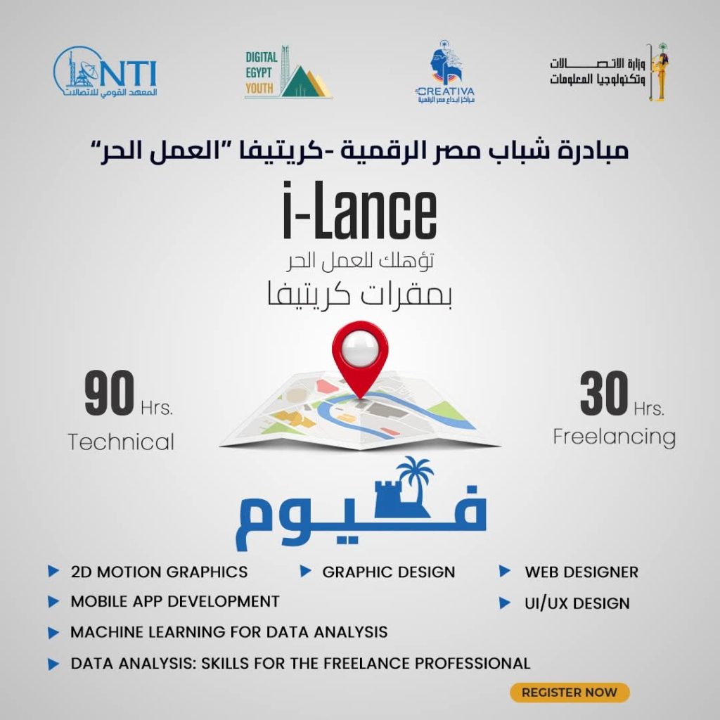 أعلن المعهد القومي للاتصالات عن فتح باب التسجيل في برنامج i-Lance ضمن مبادرة شباب مصر الرقمية بمراكز إبداع مصر الرقمية في جامعة القاهرة والفيوم وقنا وبني سويف والوادي الجديد والعريش وأسيوط والمنيا وسوهاج وأسوان.
