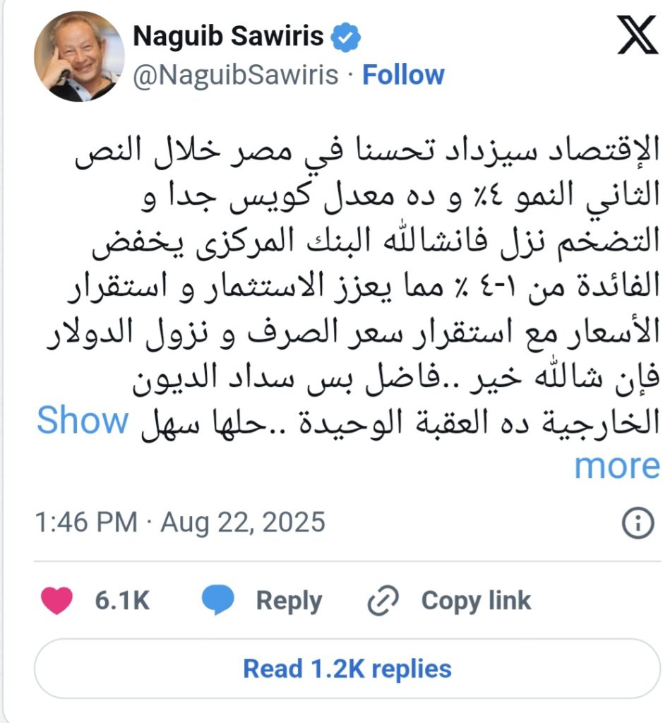 وقال ساويرس، عبر حسابه بمنصة «إكس»: «الاقتصاد سيزداد تحسنا في مصر خلال النصف الثاني النمو 4% وده معدل كويس جدا، والتضخم نزل فإن شاء لله البنك المركزي يخفض الفائدة من 1-4%، ما يعزز الاستثمار واستقرار الأسعار مع استقرار سعر الصرف ونزول الدولار، فإن شاء لله خير. فاضل بس سداد الديون الخارجية ده العقبة الوحيدة… حلها سهل الدولة تطرح الأراضي المتبقية في الساحل الشمالي والبحر الأحمر بالدولار للمصريين والأجانب، وتخصخص الكام شركة اللي بقالنا ميت سنة بنقول هنخصخصها».
