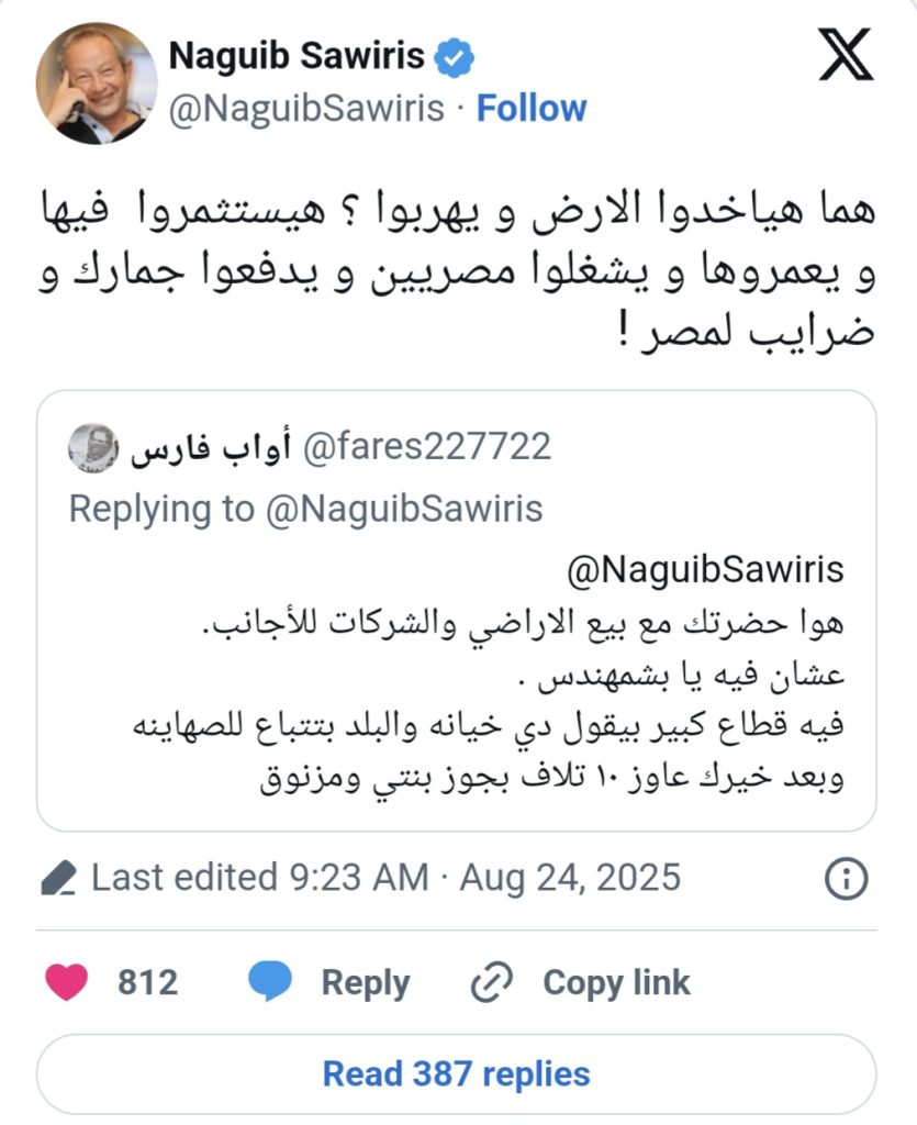 وعلق أحد المتابعين لـ ساويرس على منصة «إكس»، إذ كتب: «هو حضرتك مع بيع الأراضي والشركات للأجانب. عشان فيه يا بشمهندس. فيه قطاع كبير بيقول دي خيانة والبلد بتتباع للصهاينة».
