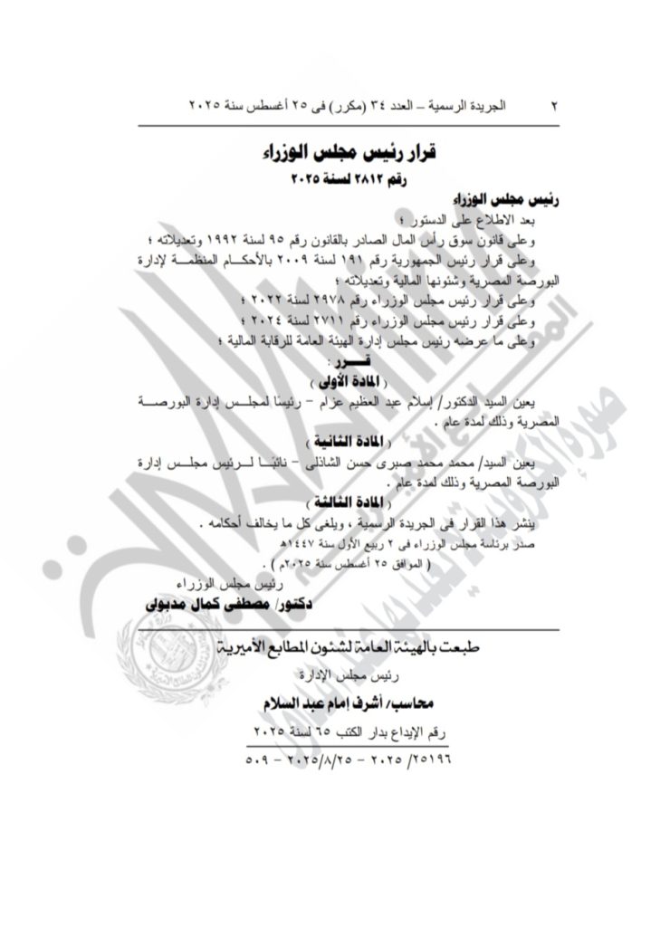 أصدر رئيس مجلس الوزراء الدكتور مصطفى مدبولي قرارا بتعيين الدكتور اسلام عزام رئيسا للبورصة المصرية لمدة عام.
