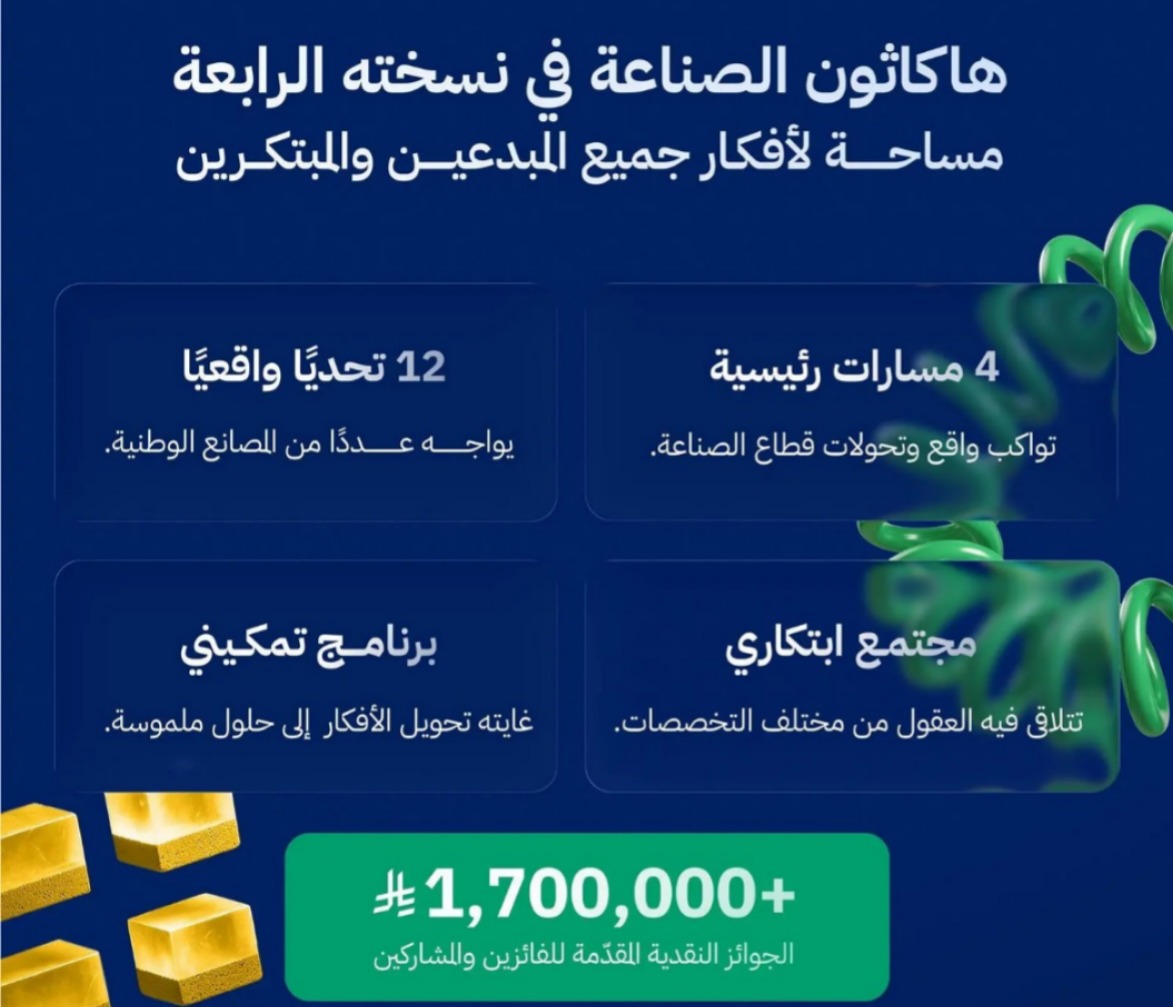 ويهدف الهاكاثون إلى استثمار الطاقات الإبداعية للمواطنين والمقيمين لتقديم حلول مبتكرة للتحديات التي تواجه المصانع الوطنية، دعمًا لإستراتيجية الصندوق في تعزيز الابتكار والتطوير، حيث تبلغ قيمة الجوائز أكثر من (1,700,000) ريال، ويستمر التسجيل حتى 1 أكتوبر المقبل، فيما يقام الحفل الختامي لتكريم الفرق الفائزة في 25 أكتوبر 2025.