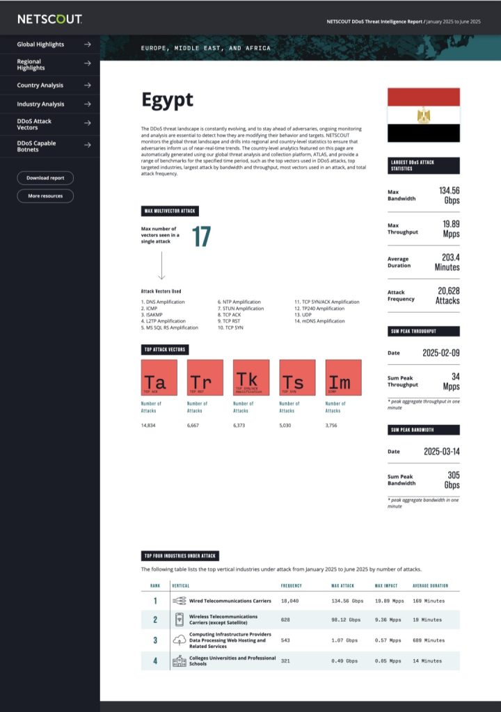 أظهر تقرير شركة نتسكاوت سيستمز أن مصر تعرضت خلال النصف الأول من عام 2025 إلى 20,628 هجوماً من نوع حجب الخدمة الموزعة (DDoS)، استهدفت بصورة رئيسية قطاعات الاتصالات والتعليم، وهي من الركائز الأساسية في عملية التحديث الاقتصادي والتحول الرقمي.