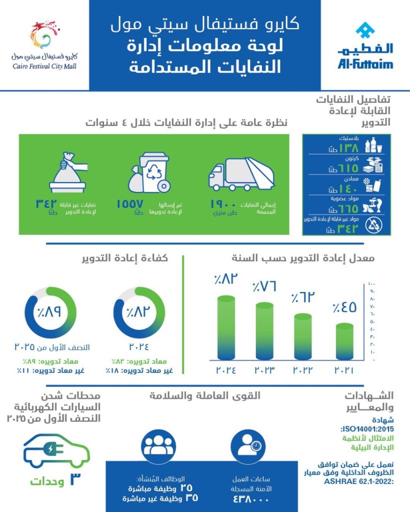 يواصل كايرو فستيفال سيتي مول، المملوك والمدار من مجموعة الفطيم العقارية، ريادته في مجال الاستدامة بقطاع التجزئة في مصر للعام الخامس على التوالي، محققًا طفرة بارزة في كفاءة إعادة التدوير التي ارتفعت من 45% في عام 2021 إلى 89% خلال النصف الأول من عام 2025.