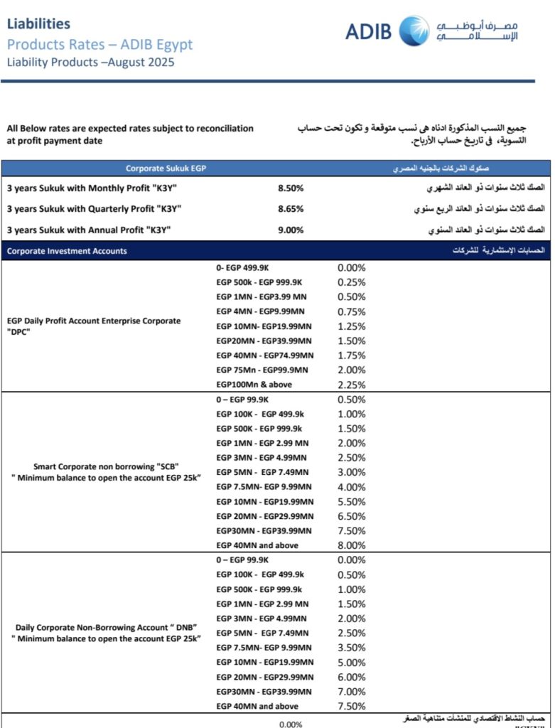 أعلن مصرف أبوظبي الإسلامي – مصر (ADIB Egypt) عن تحديث أسعار العائد على جميع منتجاته الادخارية والاستثمارية لشهر أغسطس 2025، والتي شملت حسابات التوفير والحسابات الاستثمارية والودائع والصكوك للأفراد والشركات، مؤكداً أن جميع هذه المنتجات متوافقة مع أحكام الشريعة الإسلامية وتمنح العملاء مرونة في اختيار الأوعية المناسبة لأهدافهم قصيرة وطويلة الأجل.