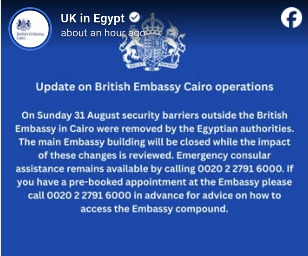 كانت السلطات المصريةقد رفعت خلال الساعات الماضية، الحواجز الأمنية، من أمام مقر السفارة البريطانية في جاردن سيتي