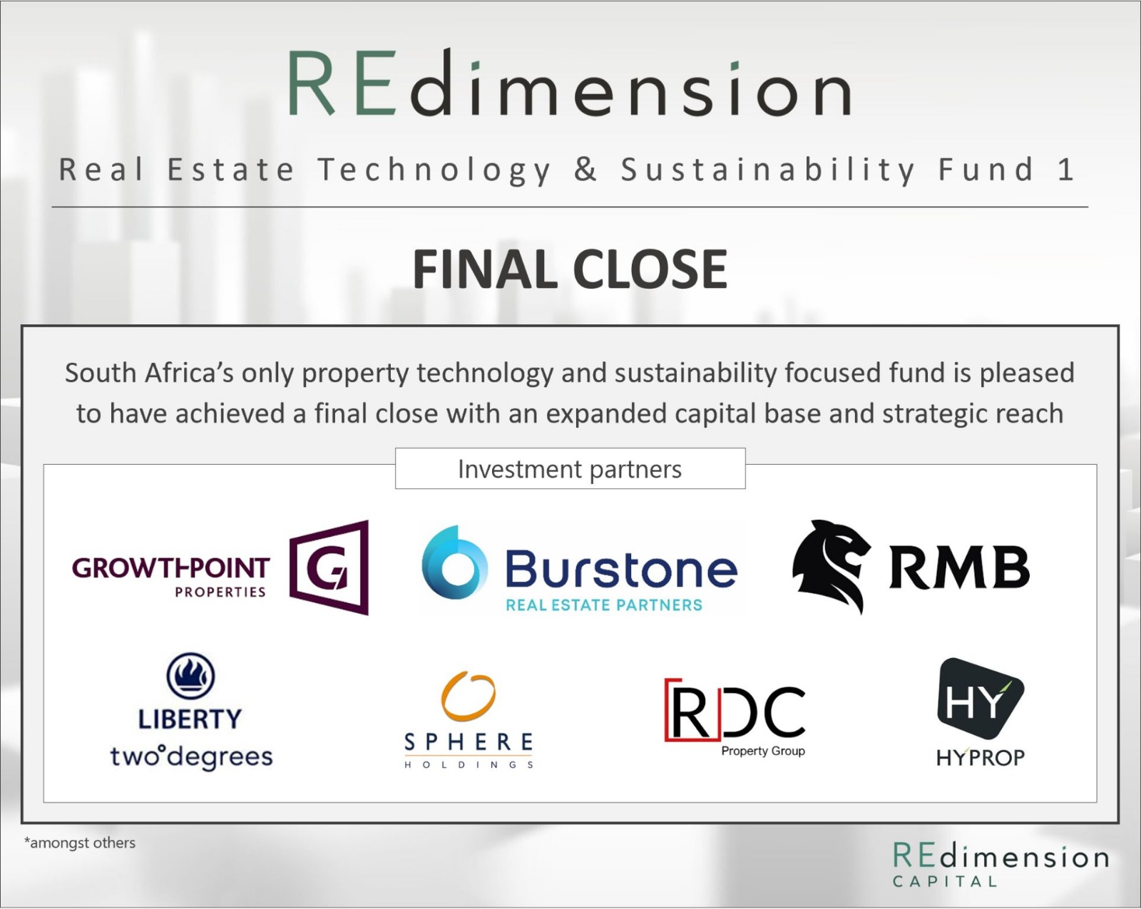 أعلنت شركة REdimension Capital الجنوب أفريقية عن الإغلاق النهائي لصندوقها الأول Real Estate Technology & Sustainability Fund I، بإجمالي التزامات تجاوزت 250 مليون راند (10.5 مليون دولار أمريكي). يركز الصندوق على الاستثمار في الشركات الناشئة بمجال التكنولوجيا العقارية (PropTech) التي تقود الابتكار والاستدامة في قطاع العقارات من خلال نموذج منصات يحقق قيمة مشتركة لشركات التطوير العقاري والمستثمرين الماليين وشركات التكنولوجيا.