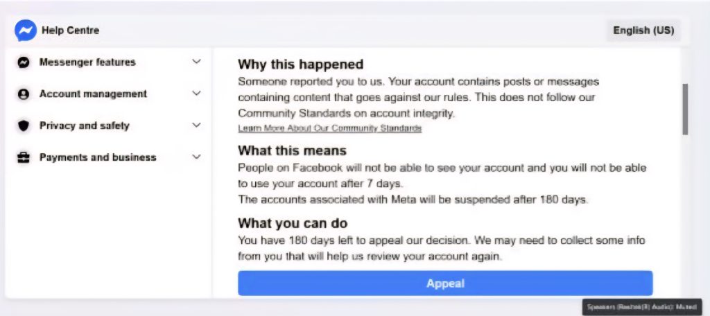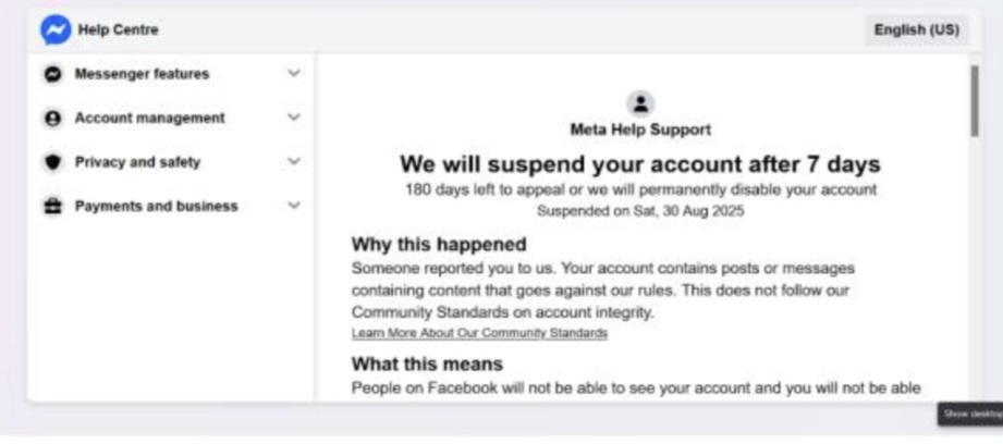 يستقبل مستخدمو فيسبوك رسائل في إطار هذه الهجمات، تحتوي على رابط يظهر في صورة إشعار زائف بحظر حساباتهم.