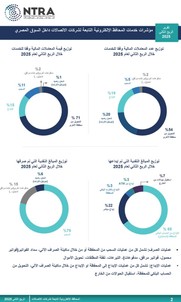 وأشار التقرير إلى أن السحب النقدي يظل النشاط المهيمن على جانب الصرف من المحافظ، حيث استحوذ على 79% من إجمالي المبالغ المصروفة خلال الربع الثاني من 2025.