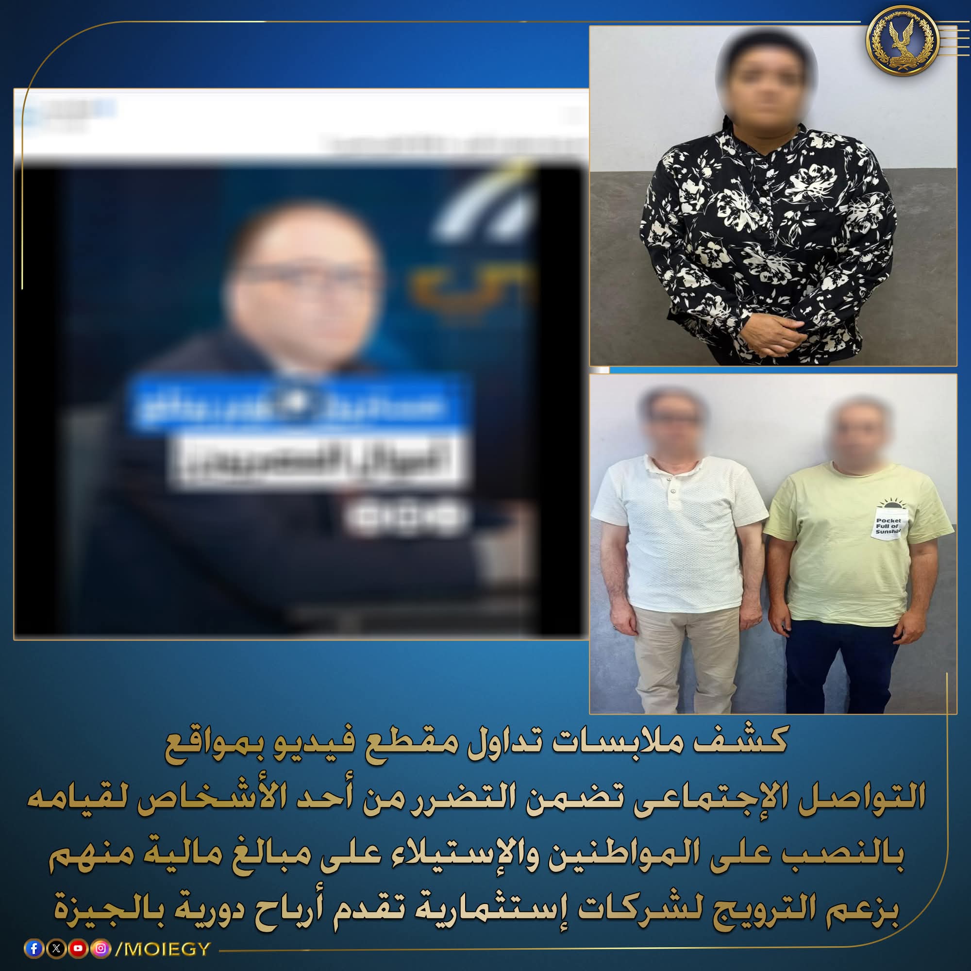 أعلنت وزارة الداخلية أنه فى إطار كشف ملابسات تداول مقطع فيديو عبر مواقع التواصل الاجتماعى، تضمن تضرر عدد من المواطنين من قيام أحد الأشخاص بالنصب عليهم والاستيلاء على مبالغ مالية بزعم الترويج لشركات استثمارية تقدم أرباحًا دورية بمحافظة الجيزة، فقد تمكنت الأجهزة الأمنية من ضبط المتورطين فى الواقعة.