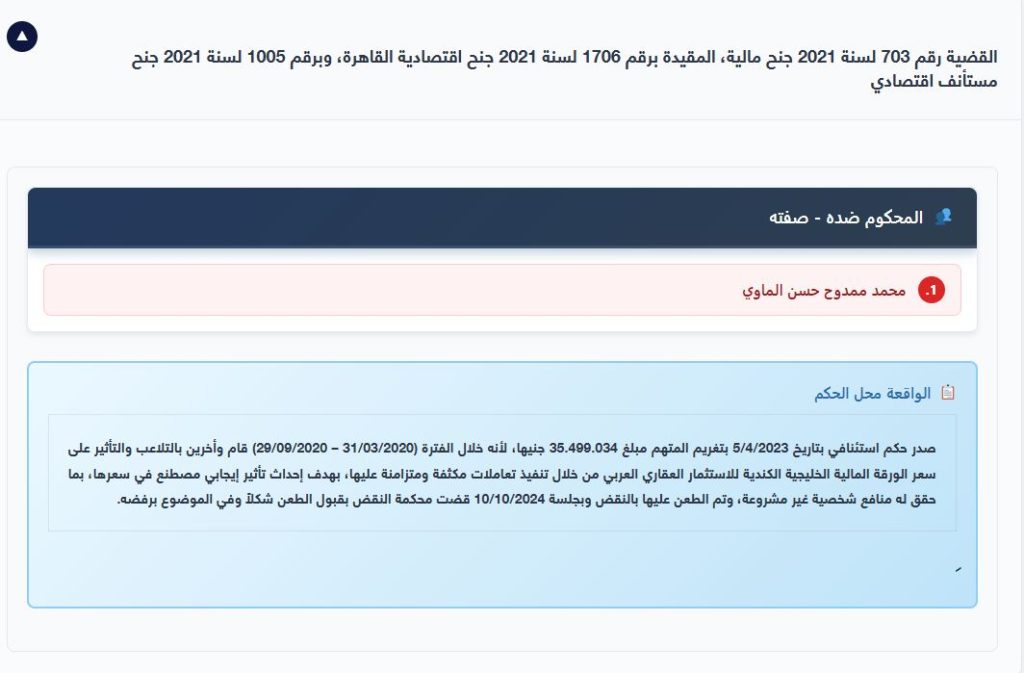 صدر حكم استئنافي بتاريخ 5/4/2023 بتغريم المتهم مبلغ 35.499.034 جنيها، لأنه خلال الفترة (31/03/2020 – 29/09/2020) قام وأخرين بالتلاعب والتأثير على سعر الورقة المالية الخليجية الكندية للاستثمار العقاري العربي من خلال تنفيذ تعاملات مكثفة ومتزامنة عليها، بهدف إحداث تأثير إيجابي مصطنع في سعرها، بما حقق له منافع شخصية غير مشروعة، وتم الطعن عليها بالنقض وبجلسة 10/10/2024 قضت محكمة النقض بقبول الطعن شكلاً وفي الموضوع برفضه.