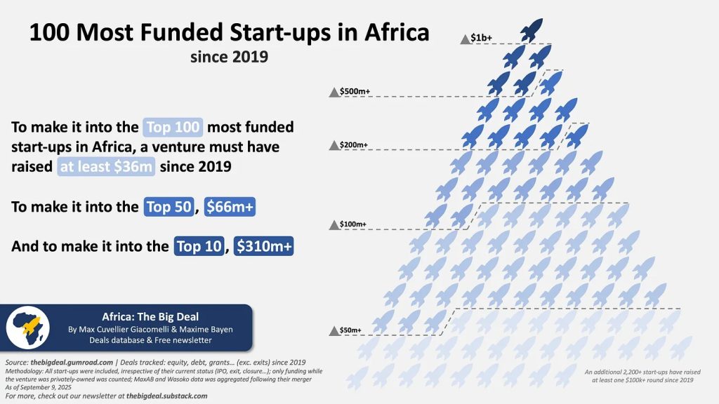 حدد موقع Africa: The Big Deal شرطًا لدخول قائمة أكبر 100 شركة ناشئة تمويلاً، وهو جمع تمويل لا يقل عن 36 مليون دولار منذ 2019.