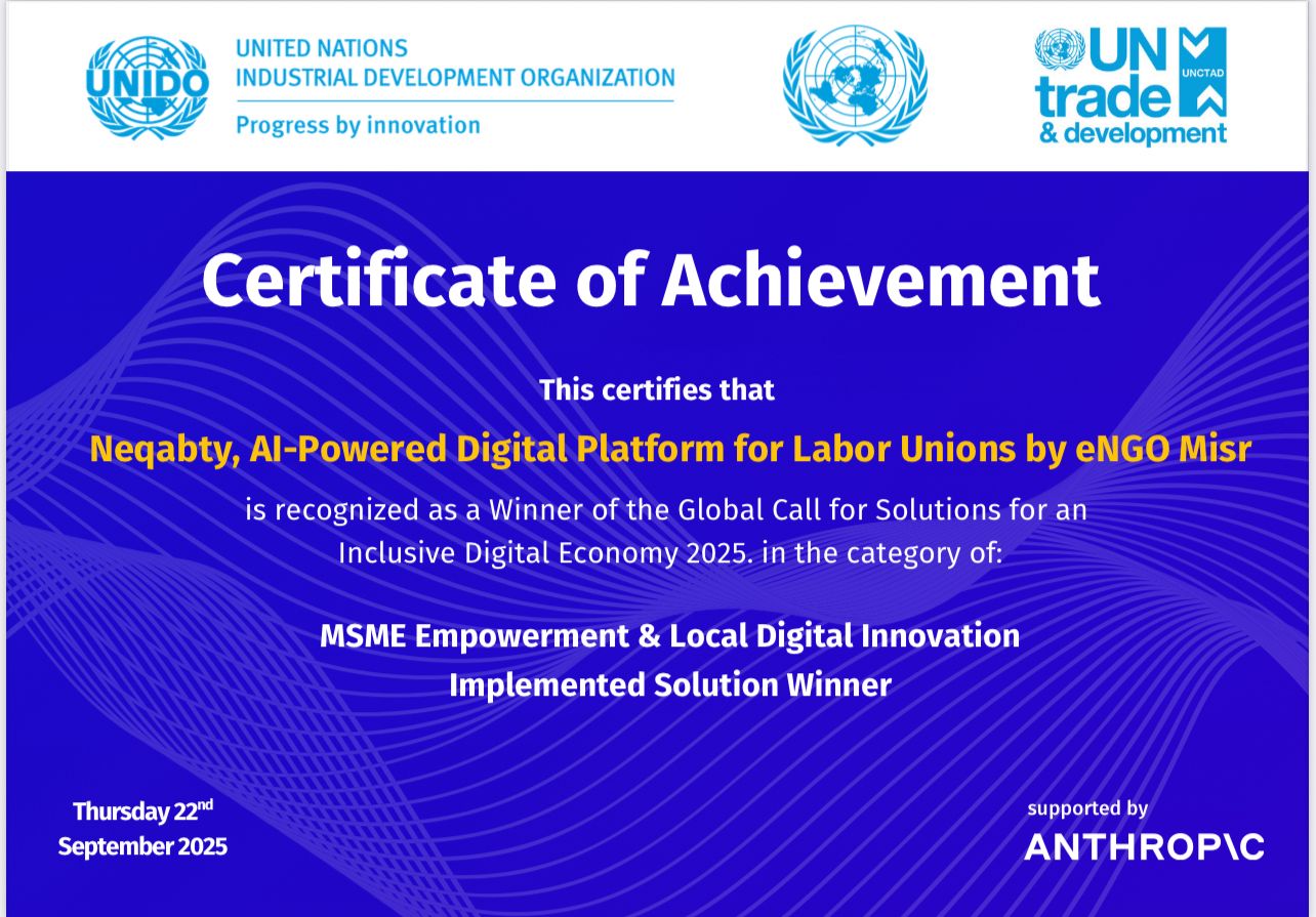 في خطوة تؤكد مكانة مصر المتقدمة في مسيرة التحول الرقمي العالمي، أعلنت منظمة الأمم المتحدة للتنمية الصناعية (UNIDO) فوز منصة “نقابتي” – Neqabty، المصرية التابعة لشركة ENGO Misr، بجائزة Global Call for an Inclusive Digital Economy 2025، عن فئة تمكين المشروعات الصغيرة والمتوسطة والابتكار الرقمي المحلي – الحلول المطبقة.